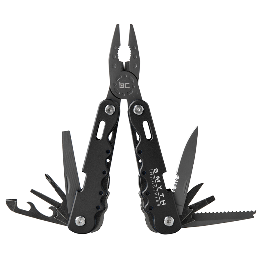 13-in-1 420 stainless steel and anodized aluminum multi-tool with: needle nose pliers, regular pliers, wire cutters, 440 drop-point knife, file, saw, small flathead, medium flathead, large flathead, can opener, bottle opener, Phillips, and hook disgorger. Housed in heavy duty nylon sheath with large hook and loop closure and belt loop (included). Sheath includes MOLLE friendly webbing.