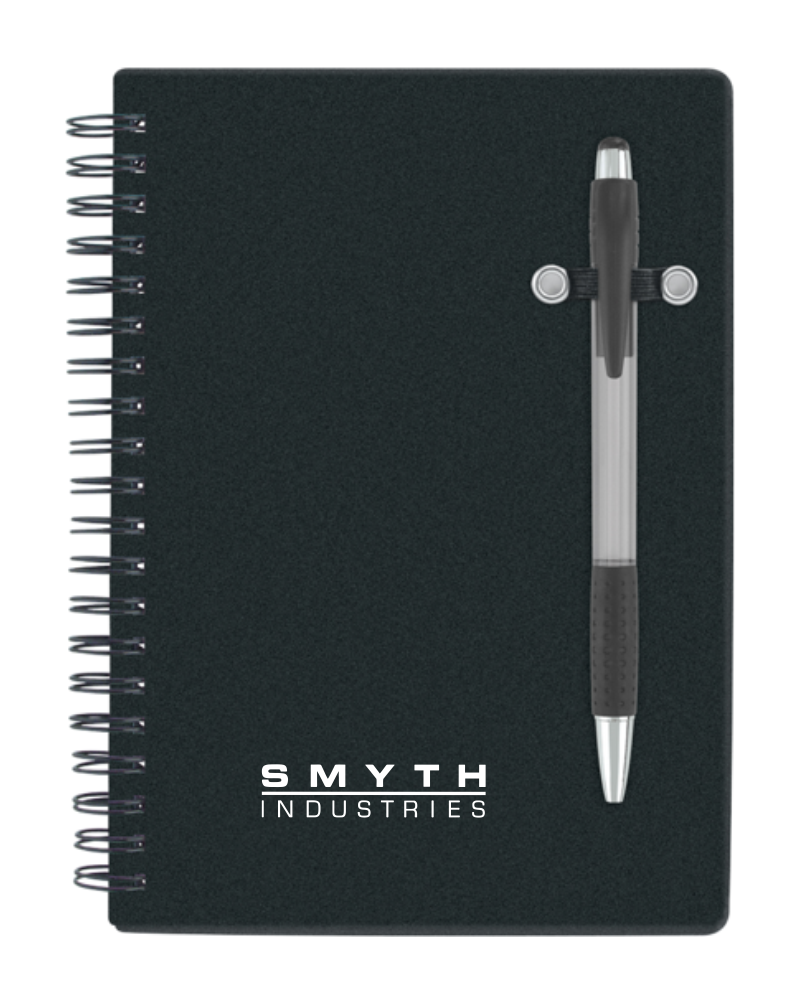 Spiral bound 70 sheet lined notebook; bright translucent color cover; matching translucent color ballpoint pen.