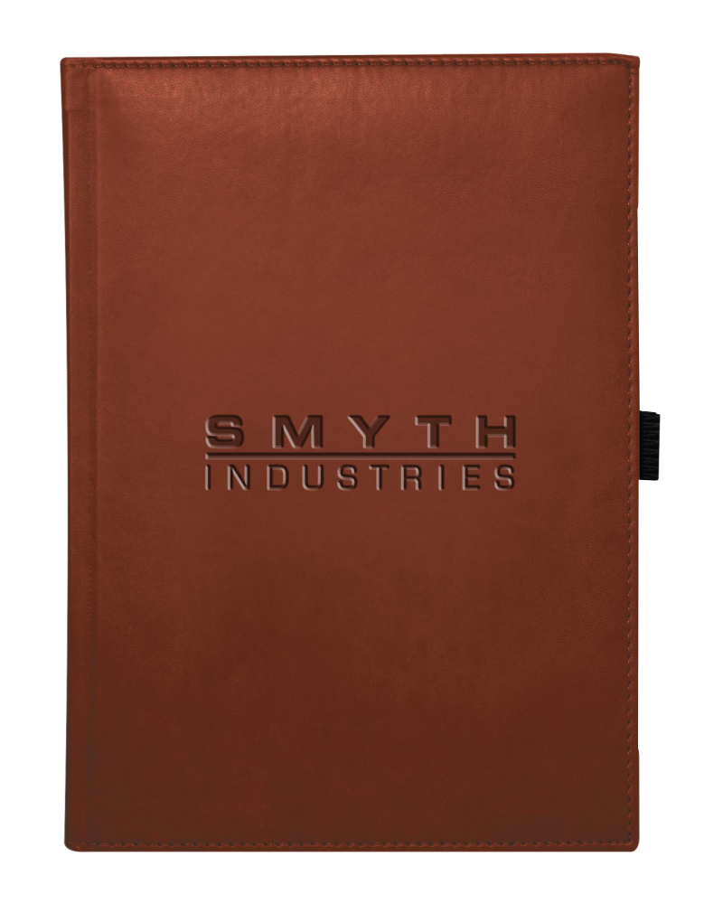 The 7'' x 10'' FSC® Mix Pedova™ Large Bound Journal is a hardcover bound journal featuring Italian UltraHyde construction. It contains 125 sheets of FSC® Mix white lined paper with built-in ribbon page markers to help hold your place between uses. This stylish notebook also features an elastic pen loop.